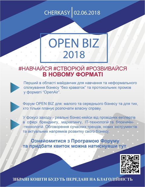 В рамках реалізації Стратегії розвитку малого та середнього підприємництва Черкаської області на 2018 – 2020 роки обласною державною адміністрацією спільно з компанією Kasyanova EVENT 2 червня 2018 року в межах 3-го фестивалю тімбілдінгу „Summer Challenge 2018“ організовується проведення економічного форуму OPEN BIZ.