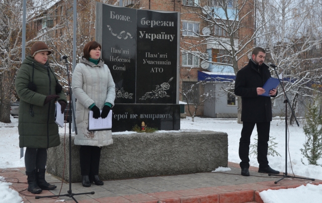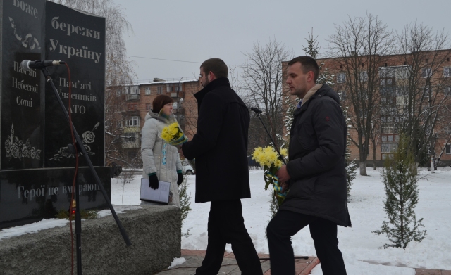 В знак глибокої пошани до загиблих Героїв, під супровід гімну Майдану «Пливе кача…», до пам’ятного знаку поклали квіти.
