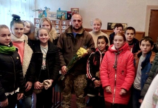 На зустріч завітали учні 7 класу школи №5 з учителем образотворчого мистецтва Людмилою Калиушко. Дмитро Валерійович поділився зі школярами спогадами про нелегкі бойові шляхи, умови життя. Відповів на численні запитання школярів про військові будні, про єдність та героїзм бойових побратимів, Всі присутні ушанували пам’ять загиблих героїв хвилиною мовчання. Діти вслухалися в кожне його слово, в якому звучала біль і тривога. Потім всі щиро привітали Дмитра з отриманням нової квартири, подякували і вручили квіти та подаруночки, зробили спільне фото на пам'ять.