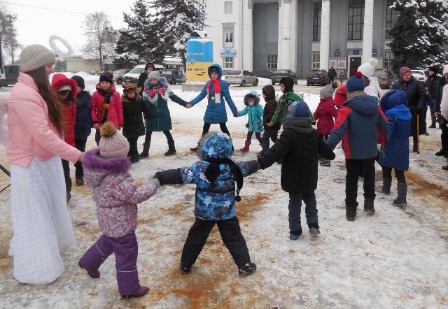 Вітали зі святом і основні персонажі дійства: Святий Миколай, Зима та Ангел, а вихованці театральної студії міського Палацу культури «НА БІС» з дітками водили хороводи, співали пісні та колядки.