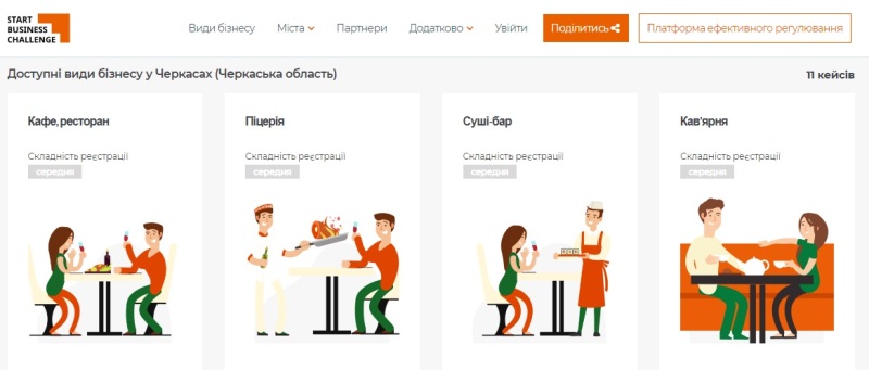 Як відкрити кафе, ресторан, піцерію, суші-бар, кав’ярню, вареничну, антикафе, бургерну, хінкальню, кафе домашнього морозива вже на сайті https://sbc.regulation.gov.ua/city/27761. Тут майбутній підприємець знайде необхідну інформацію, куди та в які установи потрібно йти саме в місті Черкаси, аби зареєструвати власну справу з наразі доступних 11 кейсів.