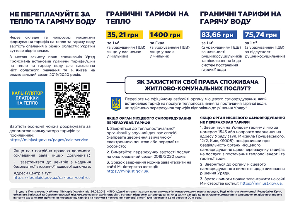 Перевірте на офіційному веб-сайті органу місцевого самоврядування, який встановлює тариф на послуги теплопостачання гарячої води чи здійснено перерахунок тарифів відповідно до рішення Уряду (постанова КМУ від 26.06.2019 № 560).