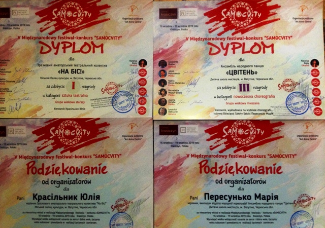 В період з 16 по 19 вересня 2019 року солістка-вокалістка Даша Молочева (керівник Ольга Матвійчук) та два творчі колективи міста Ватутіне, а саме: ансамбль народного танцю «Цвітень» Ватутінської дитячої школи мистецтв (керівник Марія Пересунько) та дитячий зразковий театральний колектив «На біс!» Ватутінського міського Палацу культури (керівник Юлія Красільнік) взяли участь в мистецькому Міжнародному фестивалі-конкурсі «SAMOCVITY» який проходив в Підкарпатському воєводстві Польщі - замку Красицьких в Красічині.
