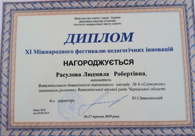 Цього року місто Ватутіне має свого дипломанта XI Міжнародного фестивалю педагогічних інновацій. Це талановита, творча, креативна вихователь-методист закладу дошкільної освіти №6 «Світлячок» загального розвитку Ватутінської міської ради Черкаської області Людмила Расулова. Назва інновації «Ігровий планшет-мобільний розвиваючий тренажер для всебічного розвитку дошкільника».