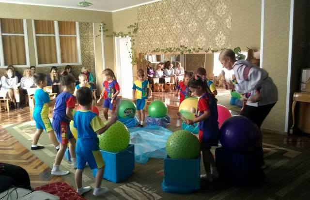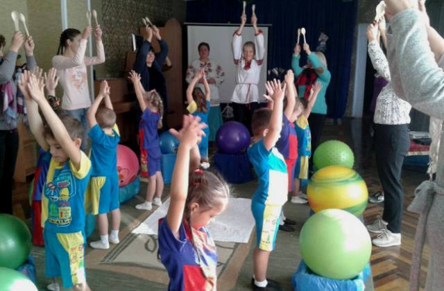 У тренуванні з барабанними паличками фізичне навантаження йде фоном, тому що увага переключена на відтворення ритму музики. Але то одна справа чути ритм, а інша справа – спробувати його зіграти, рухаючись. Вихованці закладу разом з Оленою Анатоліївною продемонстрували свою майстерність володіння грою барабанними паличками по фітболу, одночасно здійснюючи рухи. Дітлахи повністю занурилися у процес тренування, відчували себе тут і зараз, і на 100 %, взаємодіяли з вихователем.