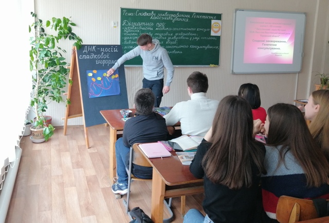 Учитель біології Катерина Жадан під час семінару-практикуму на тему «Спадкові захворювання» в 9 класі ознайомила учнів з причинами спадкових хвороб та захворювань із вадами розвитку, їх видами та профілактичним заходами щодо запобігання. На допомогу вчителю для кращого розуміння і вивчення нової теми слугували електронні засоби навчання, можливості Інтернет мережі, освітні он-лайн платформи для перевірки засвоєного матеріалу.
