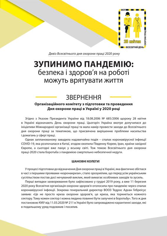 28 квітня - в Україні відзначається День охорони праці, девіз якого у 2020 році, за рекомендацією Міжнародної асоціації праці: "Зупинимо пандемію: безпека і здоров`я на роботі можуть врятувати життя"