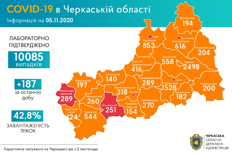 +187 нових випадків COVID-19 зафіксували на Черкащині за останню добу, 05 листопада. Про це інформує голова ОДА Сергій Сергійчук.