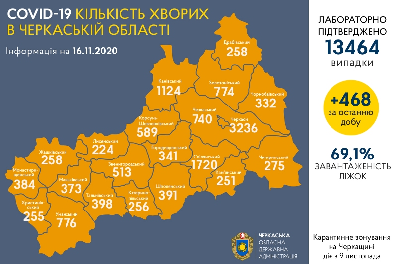Загалом із початку карантину виявили 13464 лабораторно підтверджених випадків коронавірусу.