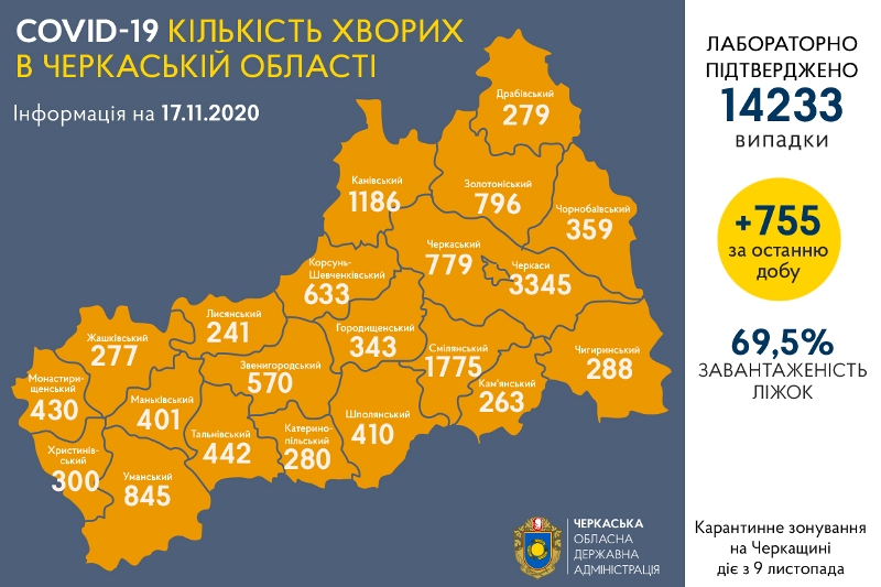 +755 нових випадків COVID-19 зафіксували на Черкащині за останню добу, 17 листопада. Про це інформує очільник Черкащини Сергій Сергійчук.