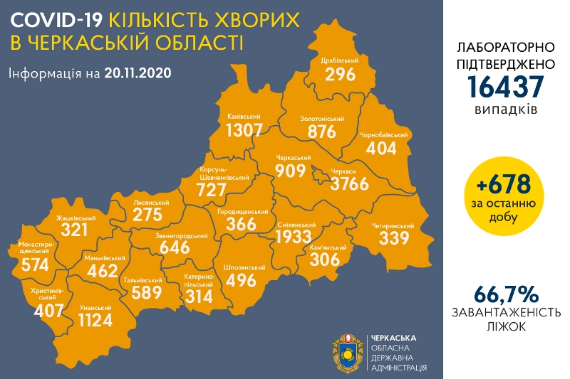 +678 нових випадків COVID-19 зафіксували на Черкащині за останню добу, 20 листопада. Про це інформує очільник Черкащини Сергій Сергійчук.