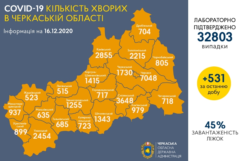 +531 новий випадок коронавірусної інфекції виявили шістнадцятого грудня на Черкащині. З початку пандемії усього підтверджених випадків – 32 803. Про це повідомляє очільник області Сергій Сергійчук.