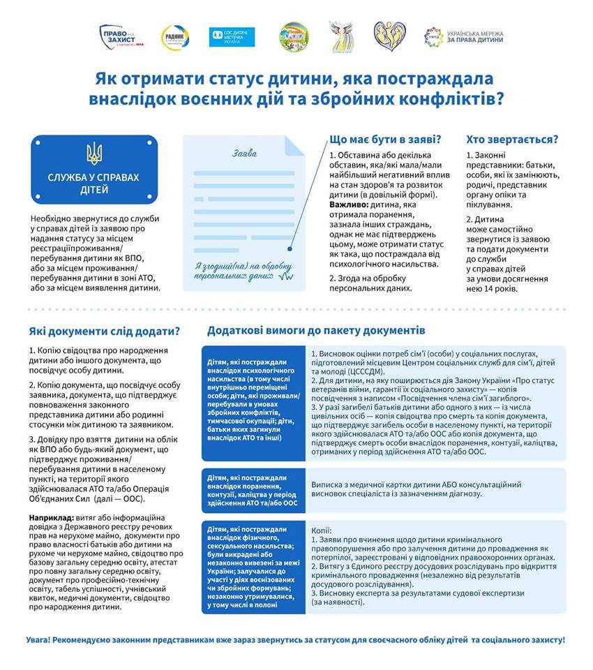 Служба у справах дітей виконкому Ватутінської міської ради Черкаської області продовжує прийом та консультування громадян, які проживають на території Ватутінської громади, з приводу надання дітям статусу постраждалих внаслідок воєнних дій та збройних конфліктів.