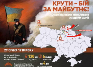 29 січня в Україні відзначається річниця бою під Крутами, який для Українського народу став символом героїзму та самопожертви молодого покоління в боротьбі за незалежність. Завдяки звитязі та сміливості українських вояків ворожий наступ більшовиків на Київ було зупинено на декілька днів. В цей час відбувалися переговори між Українською Народною Республікою і країнами Четверного союзу. 9 лютого 1918 року Брестський мирний договір було підписано. Він означав визнання самостійної Української Народної Республіки суб’єктом міжнародних відносин.