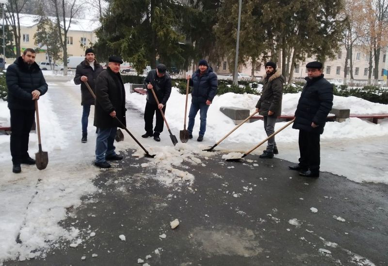 З метою убезпечення від травмування відвідувачів та працівників структурних підрозділів виконкому і міської ради, чоловіча частина колективу вийшла на прибирання від криги прилеглої до адміністративного приміщення території.