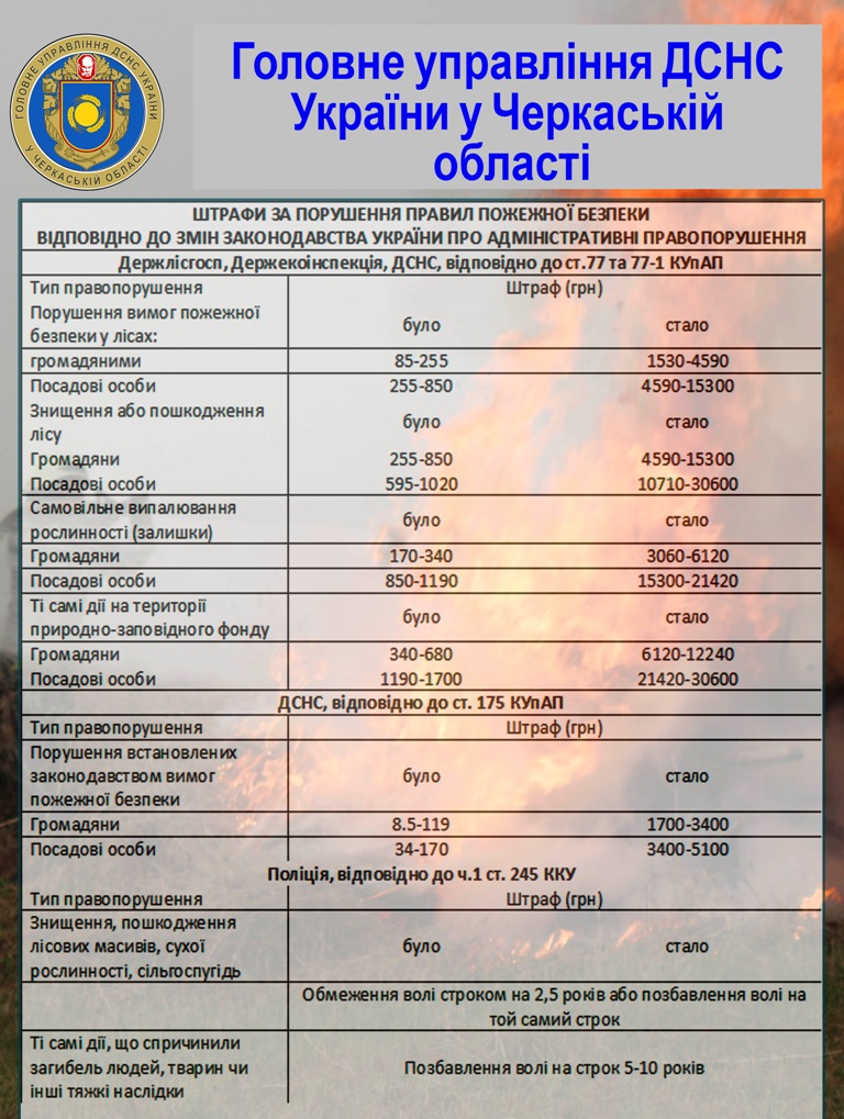 Починаючи з 17 квітня поточного року внесено зміни до КУпАП в частині посилення відповідальності громадян та посадових осіб за порушення вимог пожежної безпеки в лісах (стаття 77 КУпАП) та самовільне випалювання рослинності або її залишків (стаття 771).