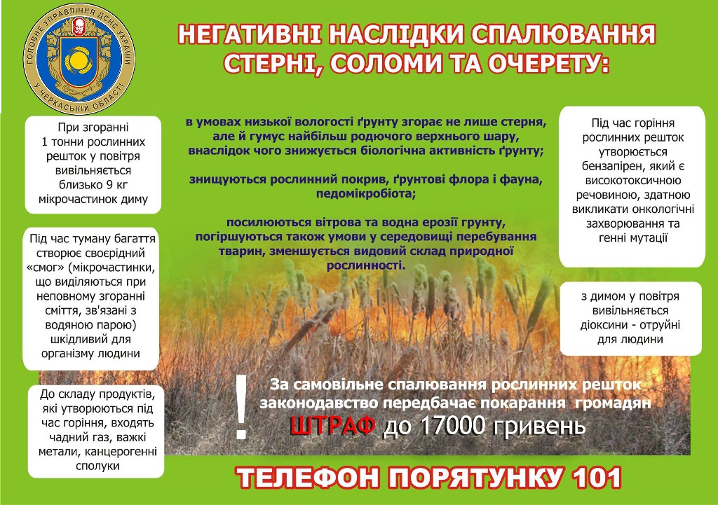 Також неодноразово наголошуємо, що спалювання стерні, післяжнивних залишків та розведення багать на полях категорично забороняється!