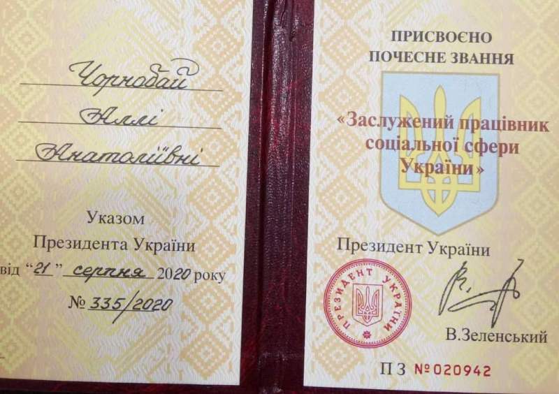 За плідну працю у цій галузі Указом Президента України від 21 серпня 2020 року №335 Аллі Чорнобай присвоєне звання Заслужений працівник соціальної сфери України.
