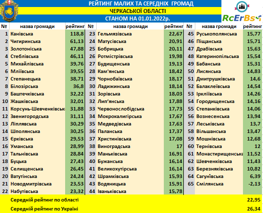 На чисельні прохання представників громад ми публікуємо повний список. До Вашої уваги громади Черкаської області за рейтингом, станом на 01.01.2022р.