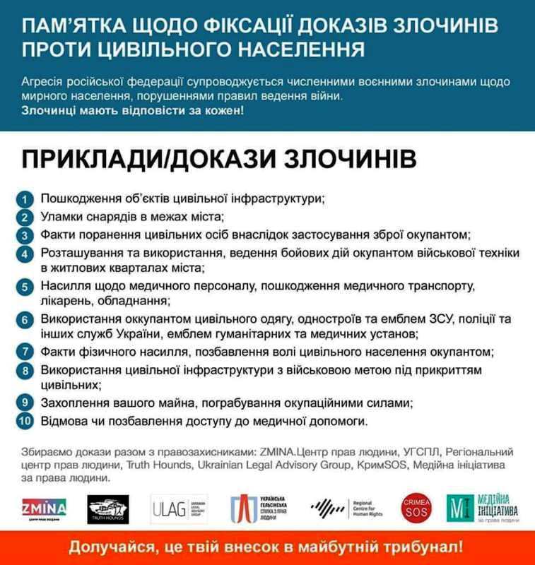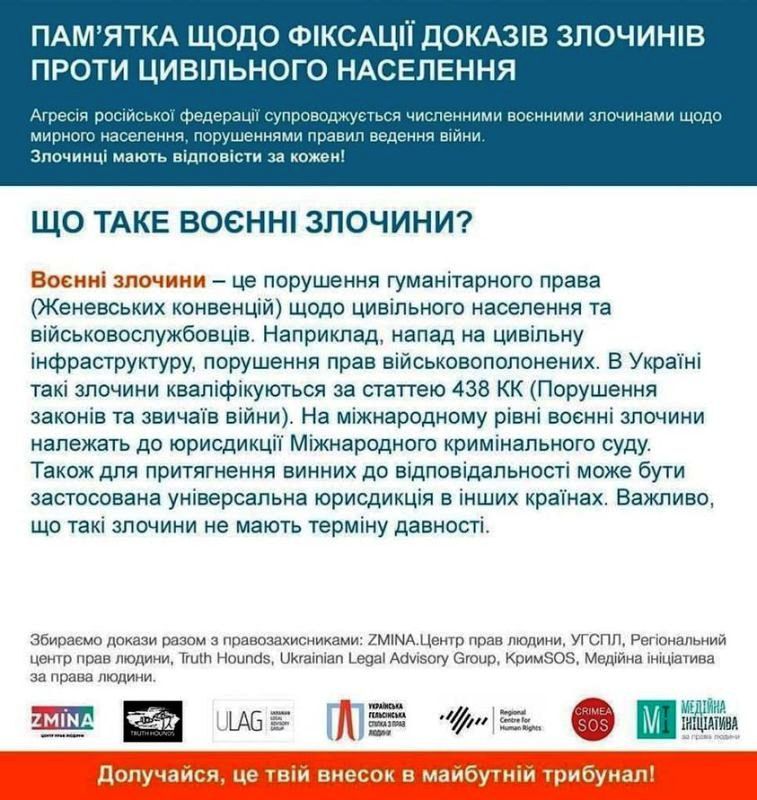 Агресія Російської Федерації супроводжується численними воєнними злочинами щодо мирного населення, порушеннями правил ведення війни. Злочинці мають відповісти за кожен!