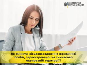 При цьому принагідно інформуємо, що 31.08.2022 набрав чинності наказ Міністерства юстиції України, яким внесено зміни, відповідно до яких в умовах воєнного стану та протягом 1 місяця з дня його припинення або скасування державна реєстрація юридичної особи та громадського формування, місце знаходженням яких є Автономна Республіка Крим, Донецька, Запорізька, Луганська, Миколаївська, Харківська, Херсонська області, місто Севастополь, проводиться незалежно від місце знаходження такої юридичної особи.