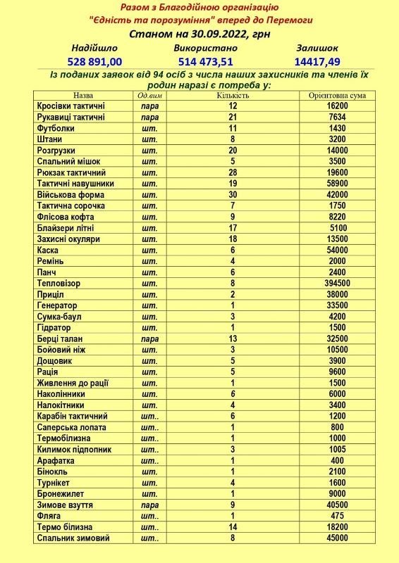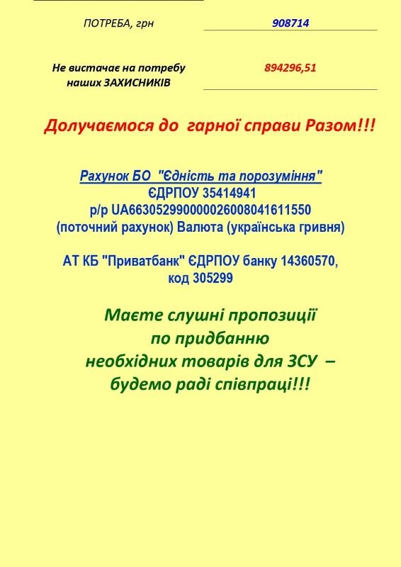 КОЖНА НАША ГРИВНЯ МОЖЕ ДОПОМОГТИ У ЗАБЕЗПЕЧЕННІ ВІЙСЬКОВОСЛУЖБОВЦІВ, ЯКІ БОРОНЯТЬ УКРАЇНУ ВІД ВОРОГА, НЕОБХІДНОЮ АМУНІЦІЄЮ ТА РЕЧАМИ. НАРАЗІ ПУБЛІКУЄМО ПОТРЕБУ НАШИХ БІЙЦІВ-ЗЕМЛЯКІВ.