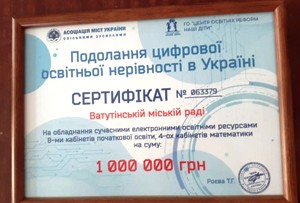 Сьогоднішнє засідання чергової 10-ї сесії міської ради розпочалось з приємної події – міський голова Олександр Заборовець вручив першому заступнику міського голови Зої Ляпун, яка курує систему освіти громади, та начальнику відділу освіти Сергію Воронюку сертифікат від Асоціації міст України на 1 000 000 грн на обладнання сучасними електронними освітніми ресурсами 8-ми кабінетів початкової освіти та 4-х кабінетів математики.