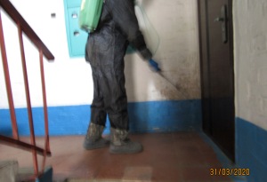 Сьогодні бригада працівників Ватутінського виробничого управління житлово-комунального господарства розпочала дезінфекцію під’їздів багатоквартирних будинків та входів до них хлоровмісною речовиною.