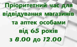 З метою убезпечення осіб, старших 65 років, які Всесвітньою організацією здоров’я визначені як найбільш вразливою категорією, та зменшення контактів, для них визначено пріоритетний час відвідування торговельних мереж роздрібної торгівлі продуктами харчування, засобами гігієни, лікарськими засобами та виробами медичного призначення, з 8 год. 00 хв. до 12 год. 00 хв. для того, щоб вони без зайвих ризиків для здоров'я і черг мали можливість зробити необхідні покупки.