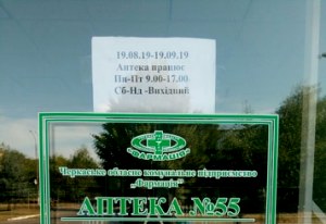 До уваги жителів міста Ватутіне та села Скаливатка! Розпорядженням Черкаського обласного комунального підприємства «Фармація» №942, в зв’язку з виробничою потребою, на період з 19 серпня по 19 вересня 2019 року змінено графік роботи Аптеки №55, що знаходиться за адресою м.Ватутіне, проспект Ватутіна, 21.